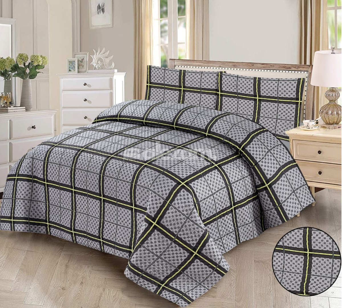 3 Pc Gray Plaid Quilted Bedsheet Set by Alezam