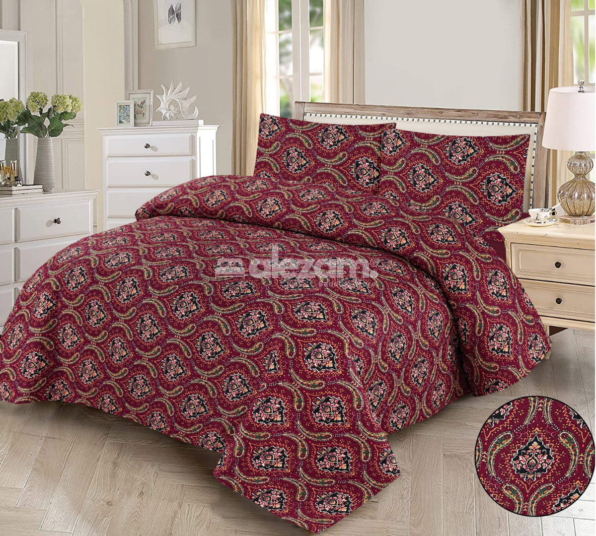 3 Pc King Size Quilted Bedsheet Maroon Paisley Motif Print