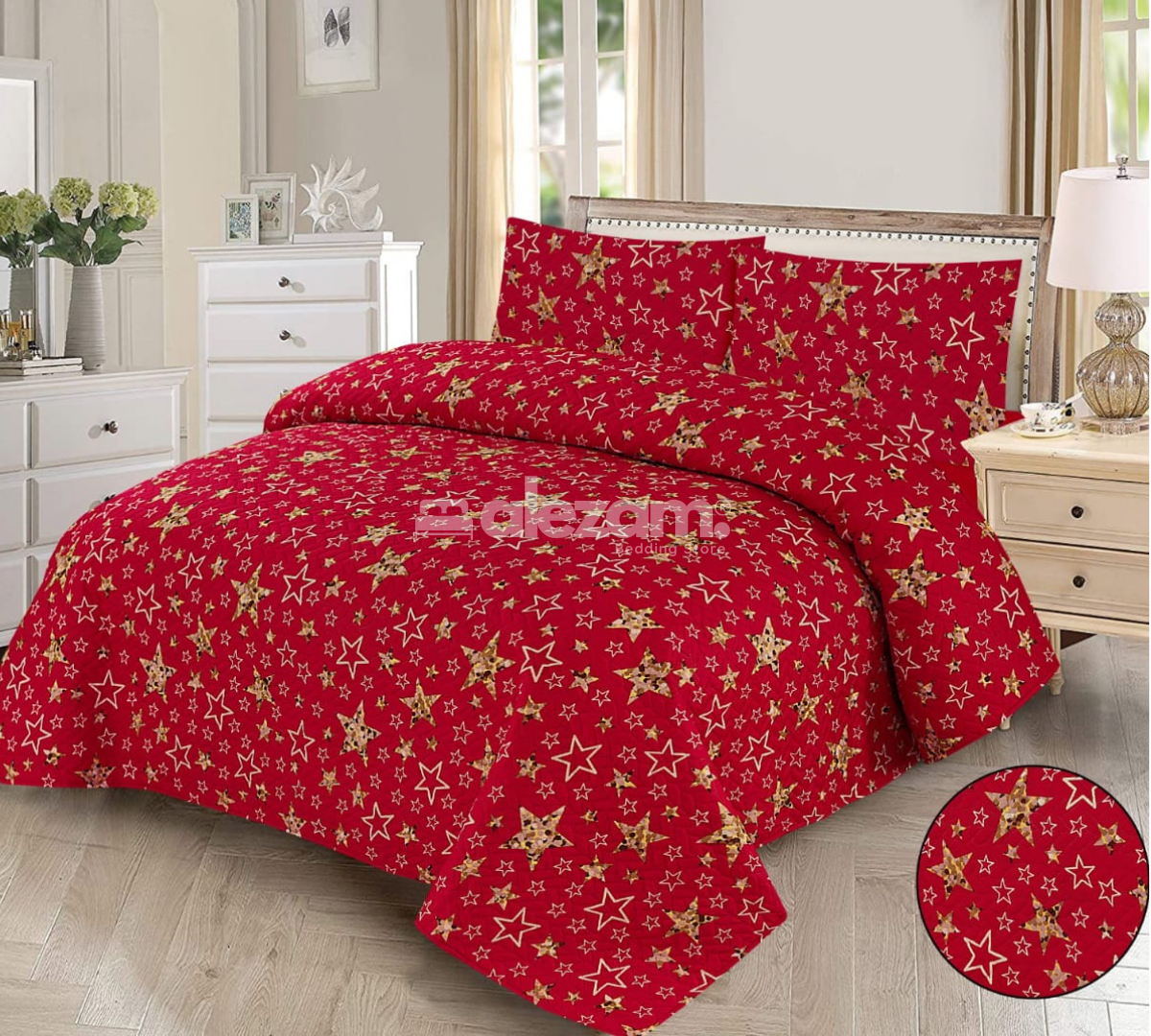 3 Pc Red Gold Star Pattern Quilted Bedsheet Set