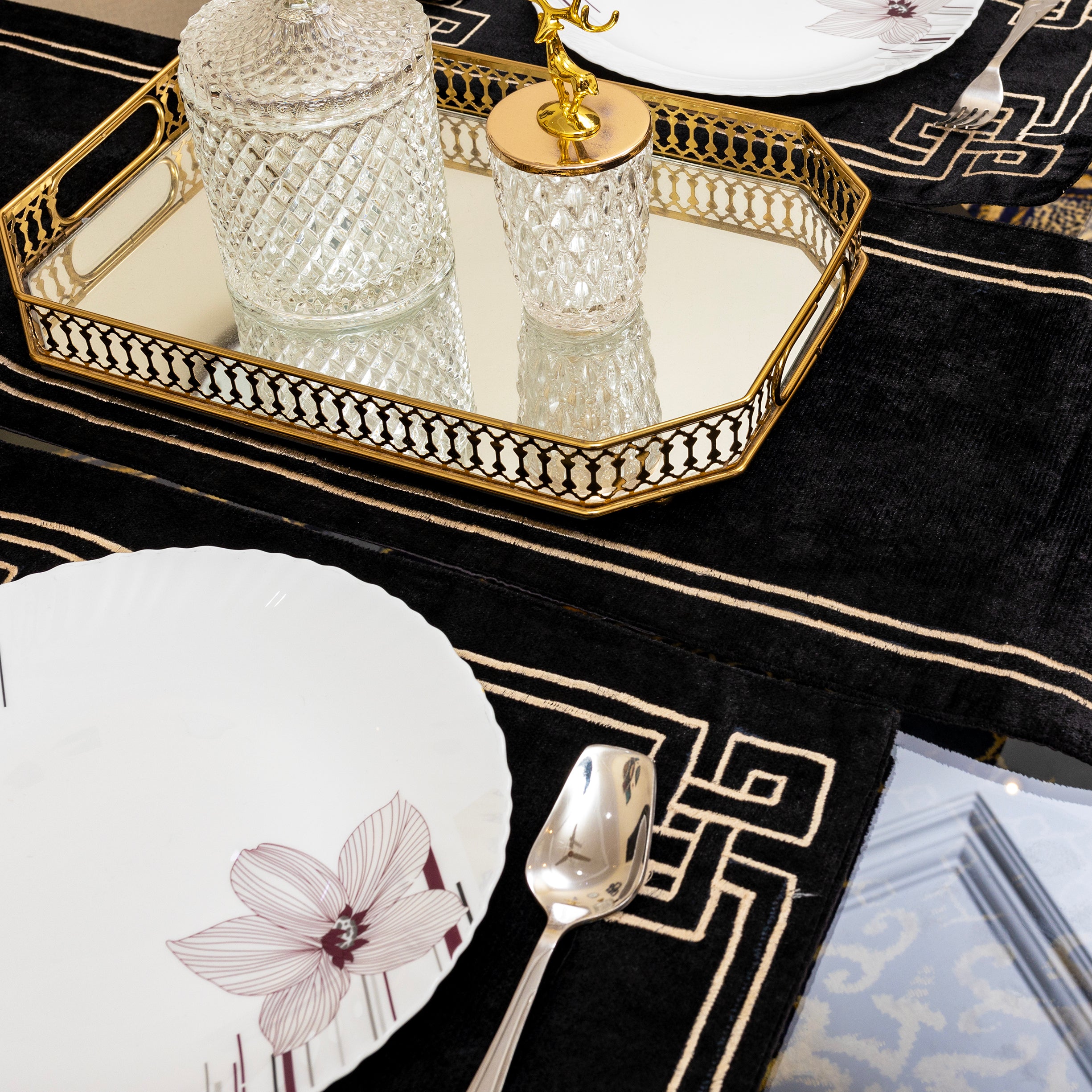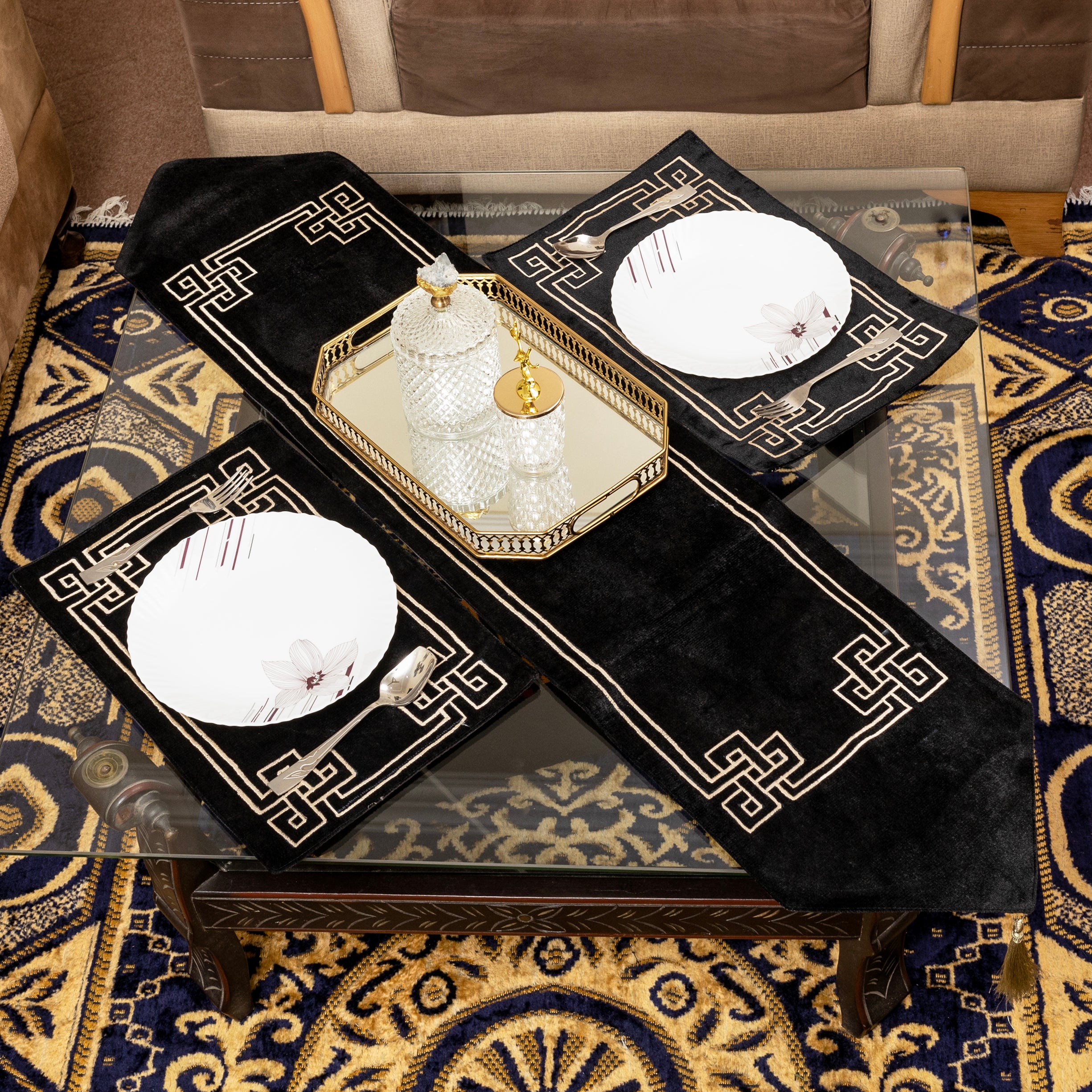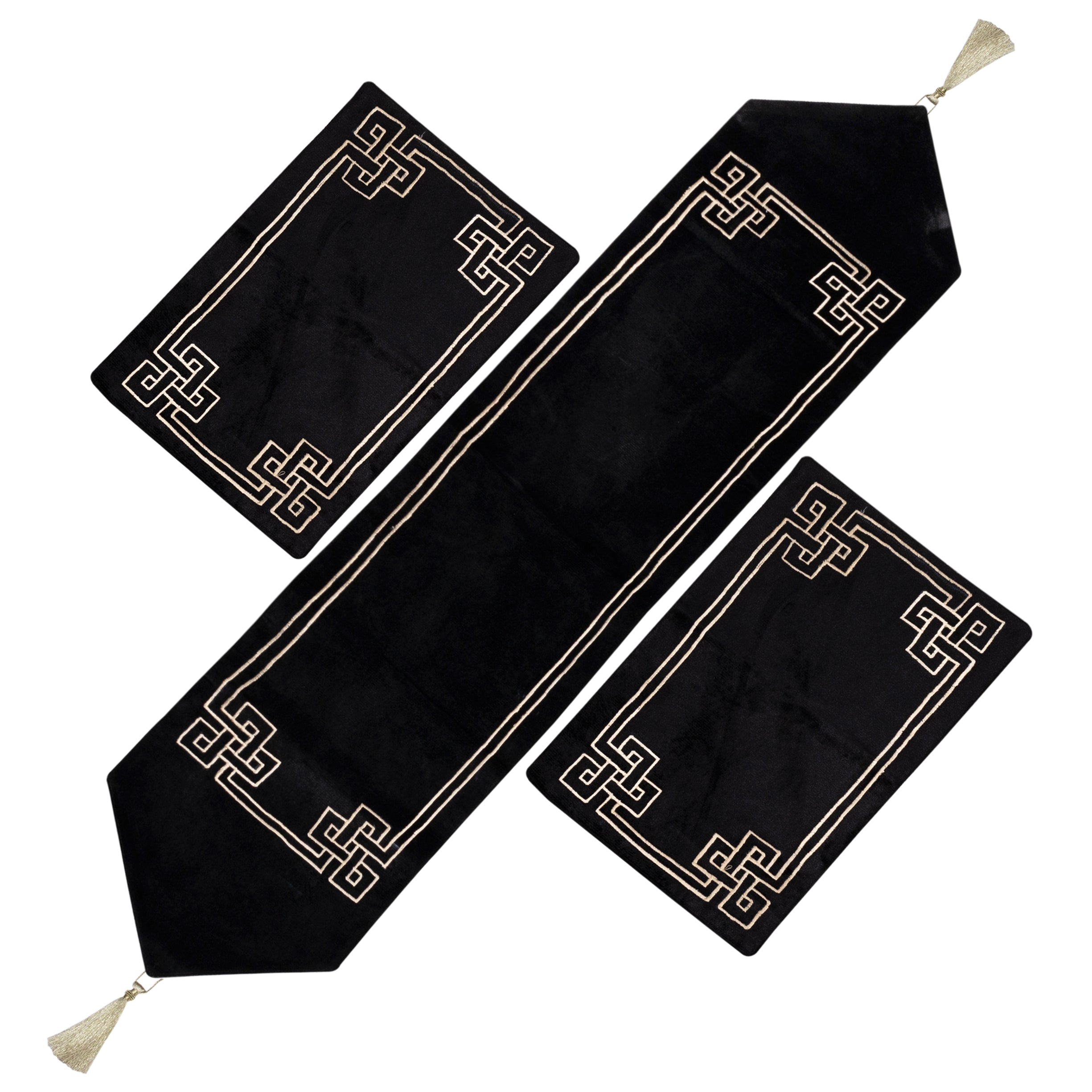 Transform your dining and living spaces with this exquisite 3 Pcs Embroidered Table Runner Set from Alezam Bedding Store. This premium table linen collection adds a touch of sophistication and classic elegance to any home decor, whether your style is modern, traditional, or transitional. Each meticulously crafted set features intricate gold geometric embroidery, inspired by the timeless Greek key pattern, on high-quality fabric. Choose between the serene Cream or the dramatic Black to perfectly complement your interior design. Ideal for protecting your dining table, coffee table, or console, these durable and stylish table runners and placemats are perfect for everyday use or special occasions. They make a thoughtful housewarming gift and are a must-have for anyone seeking to elevate their home aesthetics. This luxurious set ensures your table always looks polished and inviting. The complete package includes: 01 Table Runner (54 inches Length) and 02 Table Mats (12x18 Inches).