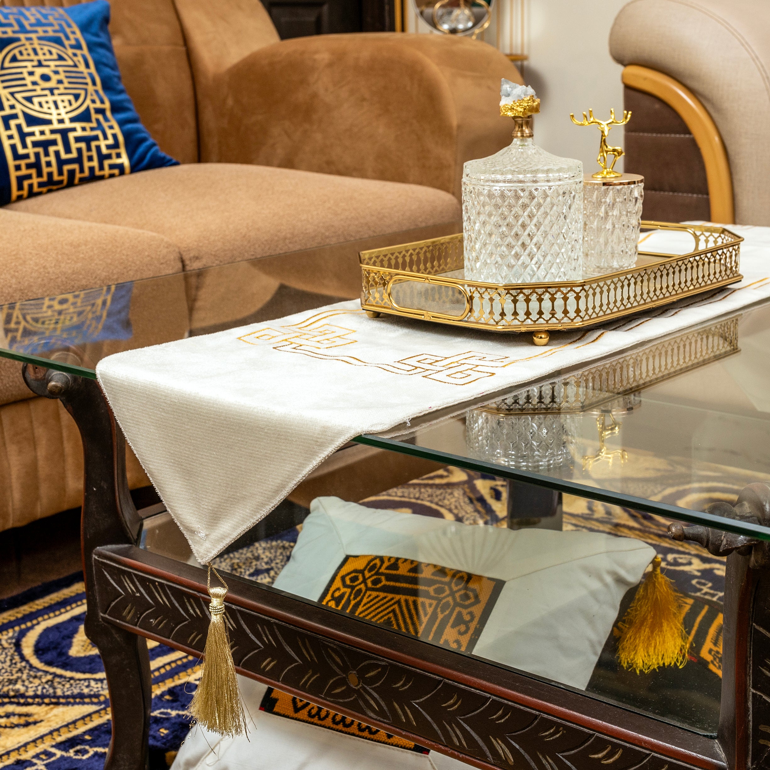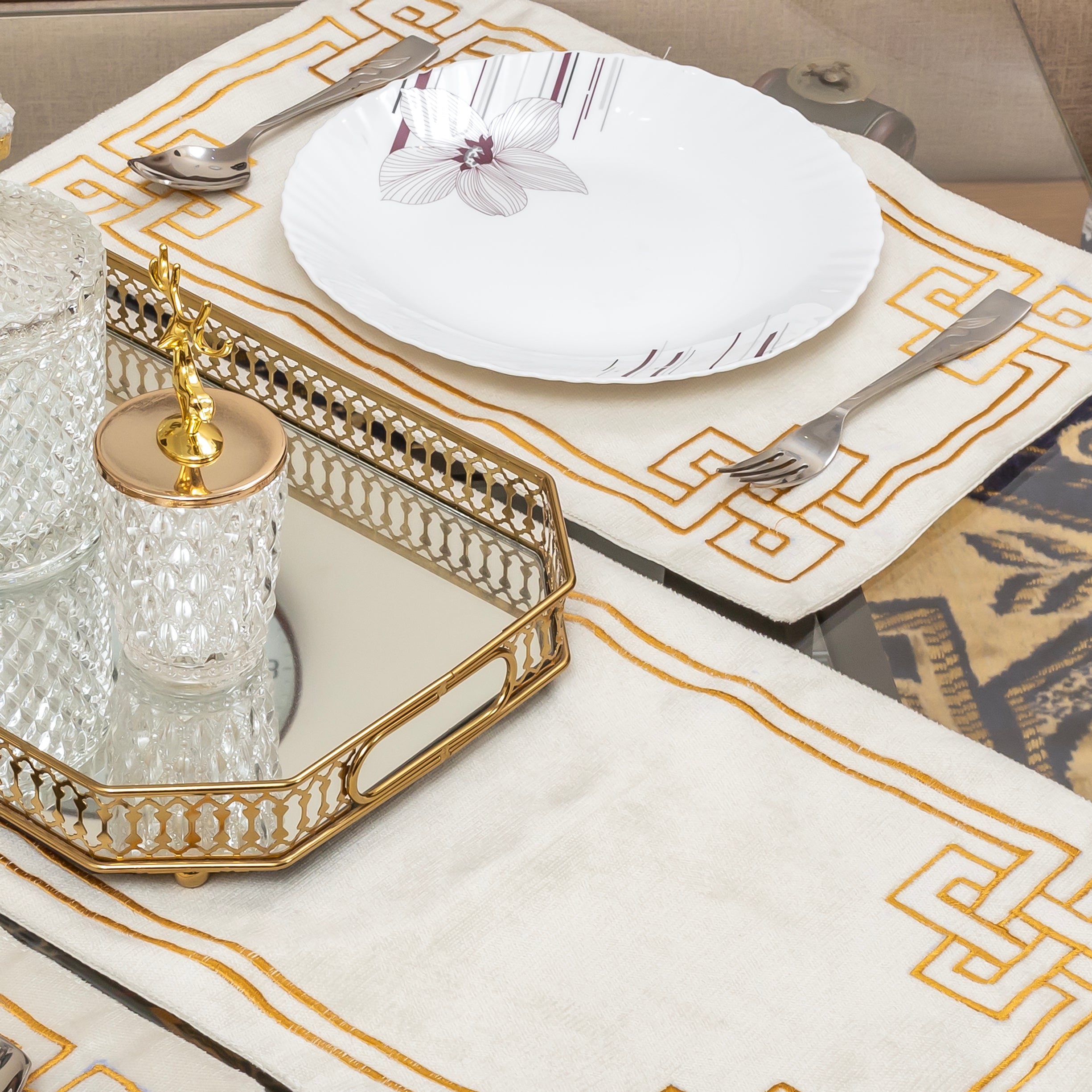 Transform your dining and living spaces with this exquisite 3 Pcs Embroidered Table Runner Set from Alezam Bedding Store. This premium table linen collection adds a touch of sophistication and classic elegance to any home decor, whether your style is modern, traditional, or transitional. Each meticulously crafted set features intricate gold geometric embroidery, inspired by the timeless Greek key pattern, on high-quality fabric. Choose between the serene Cream or the dramatic Black to perfectly complement your interior design. Ideal for protecting your dining table, coffee table, or console, these durable and stylish table runners and placemats are perfect for everyday use or special occasions. They make a thoughtful housewarming gift and are a must-have for anyone seeking to elevate their home aesthetics. This luxurious set ensures your table always looks polished and inviting. The complete package includes: 01 Table Runner (54 inches Length) and 02 Table Mats (12x18 Inches).
