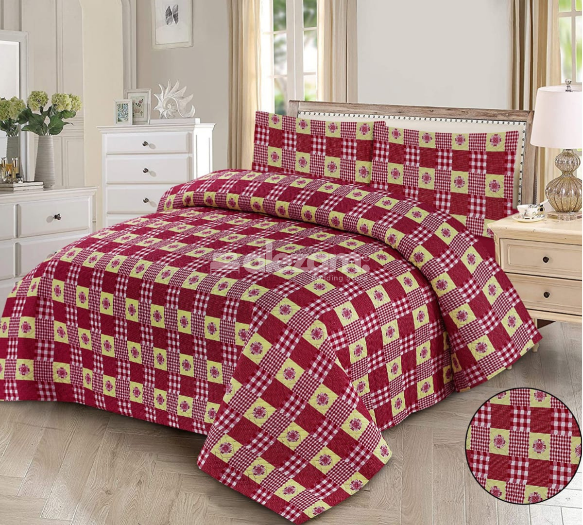 Red Yellow Plaid Quilted 3 Pcs Bedsheet Set